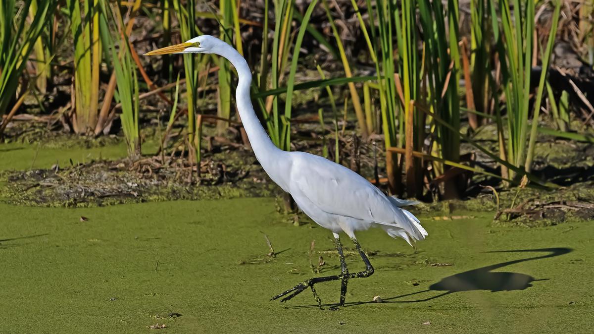 Nice framing; very sharp head; caught mid-step; background is slightly blurred; whites are lacking detail