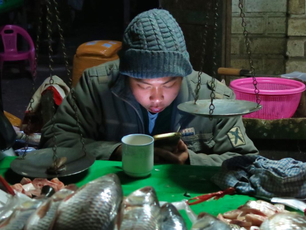 Nice light from the cell phone; interesting setting and story; pink basket sharper than subject
