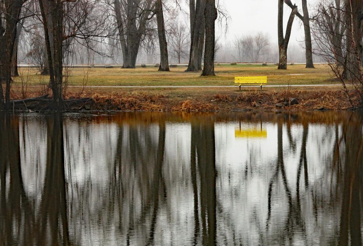Yellow bench is a strong center of interest; good crop; the foggy background provides a nice atmospheric effect; trees frame the bench; good exposure