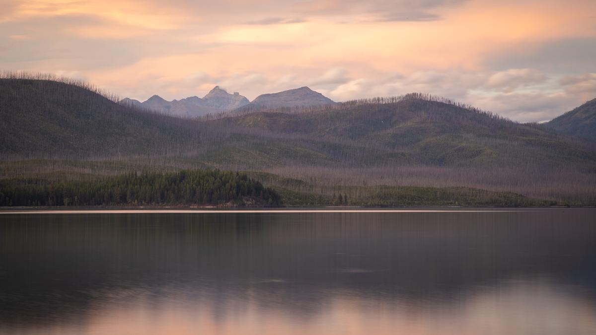 Very calming image; nice colors in the sky; the light area on the bottom takes the eye away from the mountains