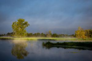A dead tree is on the left and the fog rising from the river behind it.