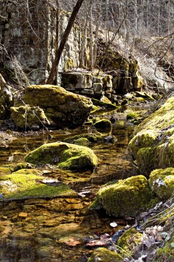 good with stream as diagonal; crop the top third; nice to see rocks underwater; nice overall photo, a little soft on the bottom