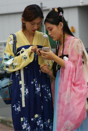 Great interaction with nice head tilt; good color; ancient and modern contrast; background is a little distracting