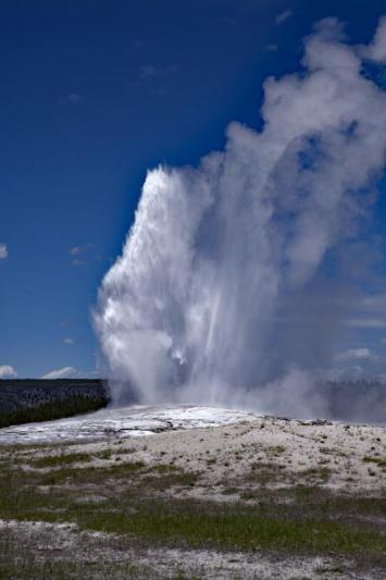 Good color; beautiful sky; interesting layered foreground; might place the geyser more to the left; could crop up to the grass on the bottom