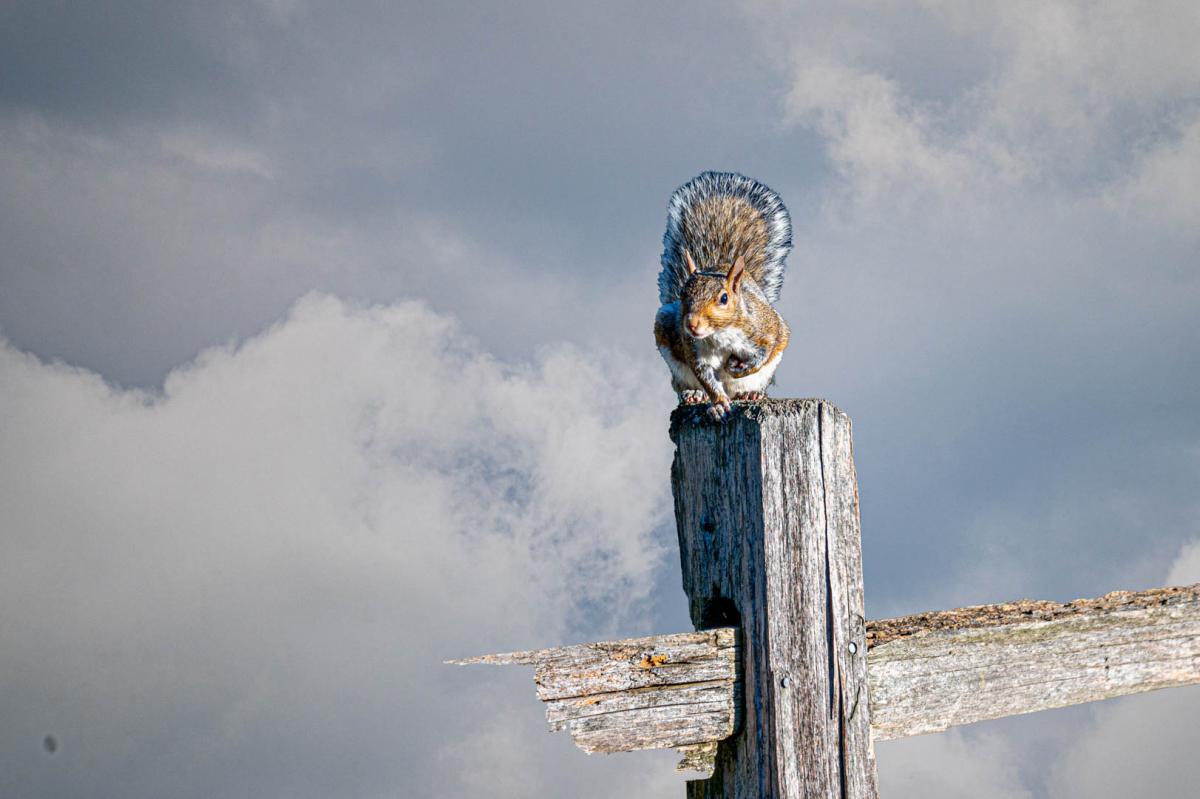 Interesting idea; the squirrel and the fence are sharp; nice sky; fur and feathers are very difficult to select for composite images; suggest cropping some of the negative space on the left
